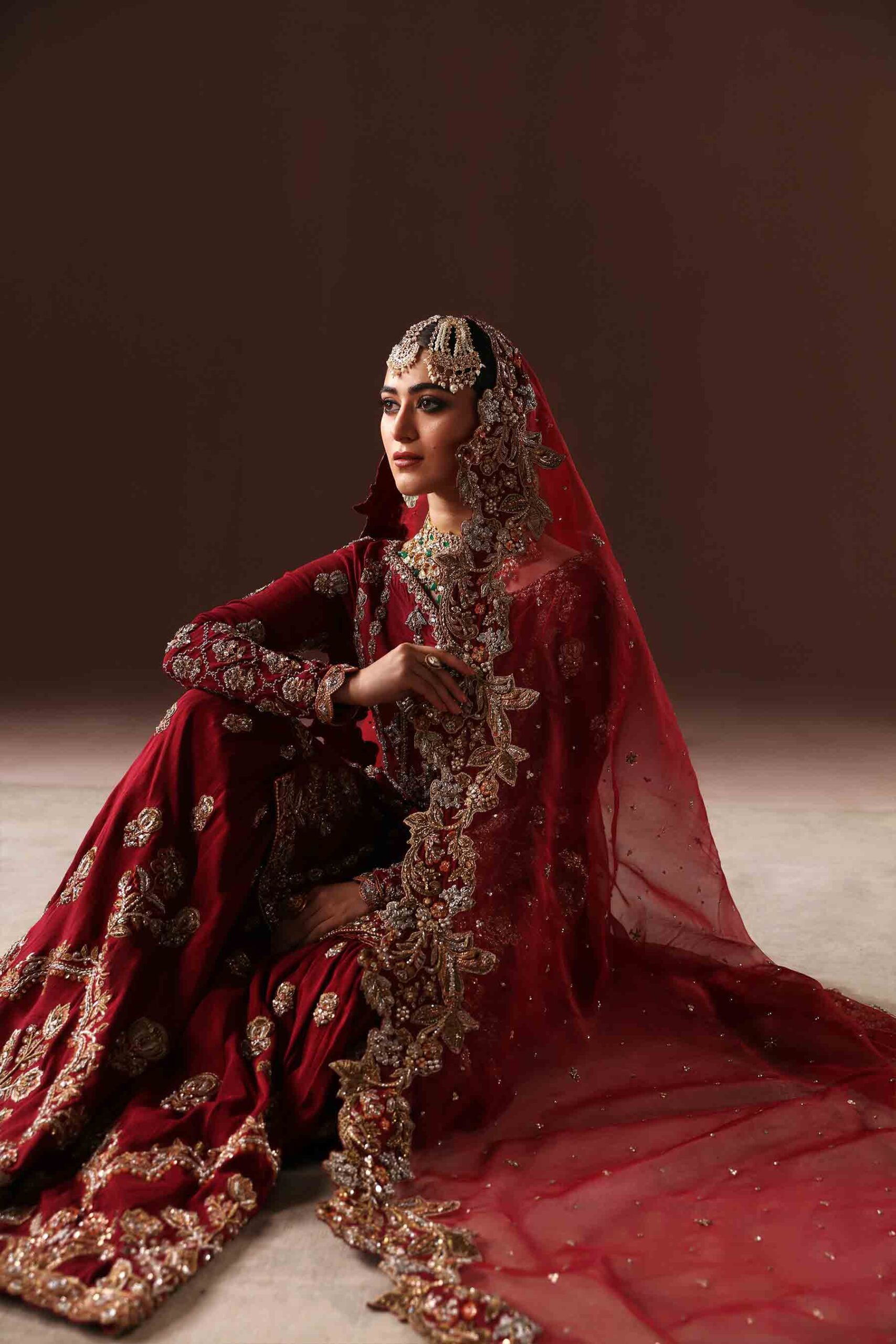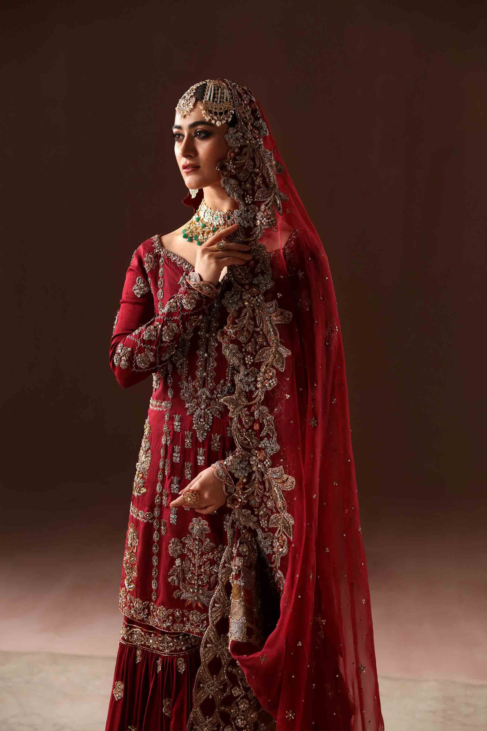A classic INSHEE red, created into an old worldly gharara and kameez, with exquisite gold zardozi and resham handwork. The dupatta is adorned with beautiful and bold scalloped borders with heavily embellished pallus with a resham chatta patti. Hours and hours of intricately crafted worksmanship by our artisans are behind each bridal creation.